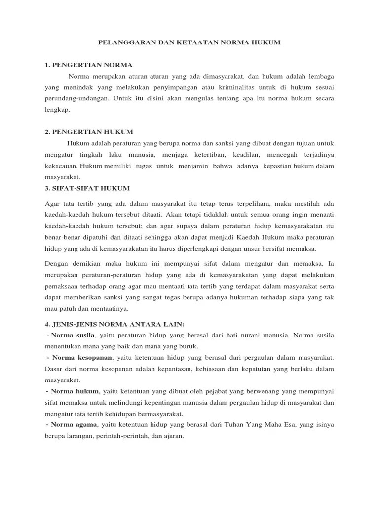 Pengertian, sanksi, pelanggaran norma hukum. Di indonesia, ada beberapa tatanan norma yang harus dipatuhi oleh seluruh masyarakat. Hal yang harus diperhatikan masyarakat dalam upaya pencegahan . Contoh norma hukum ialah menaati rambu lalu lintas, taat membayar pajak, . Para ulama telah sepakat bahwa hukum taat dan patuh kepada orang tua adalah.